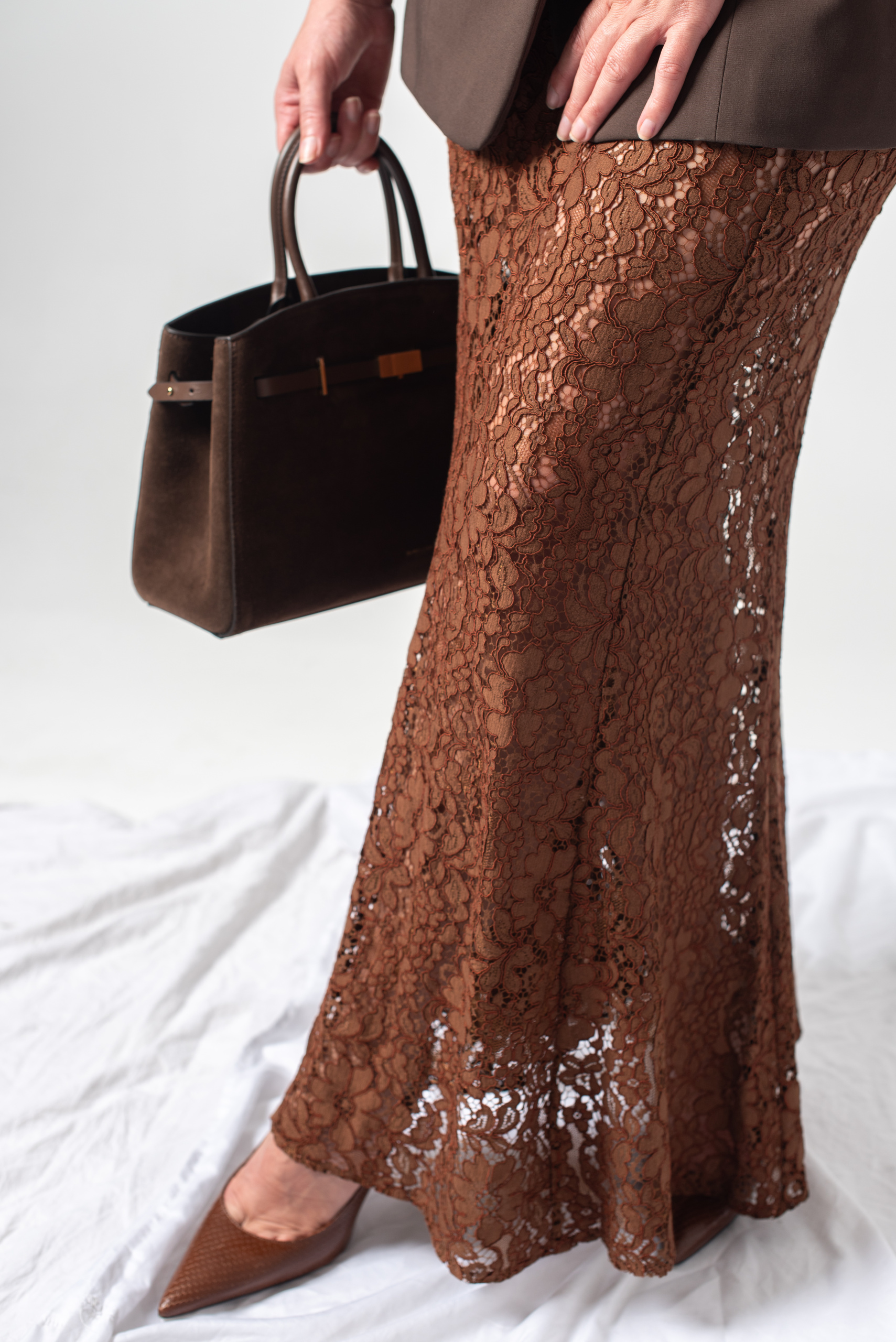 Ova elegantna suknja je dugačka, uskog visokog struka i na cif. Suknja nema podstavu.