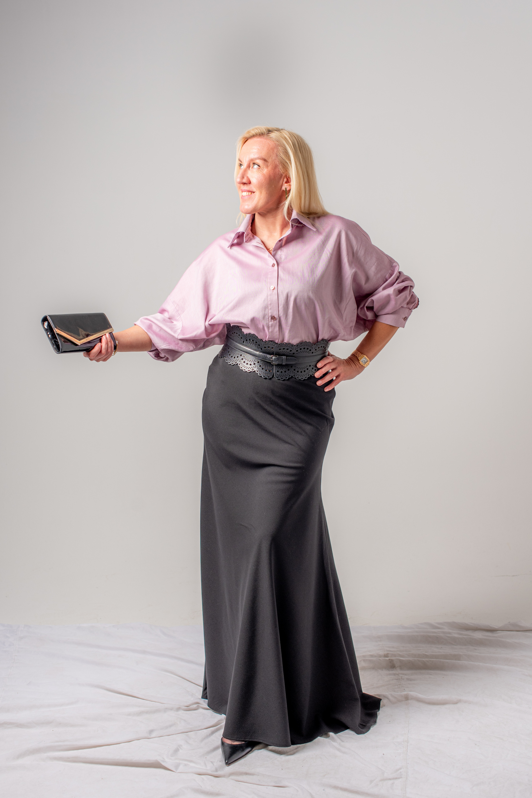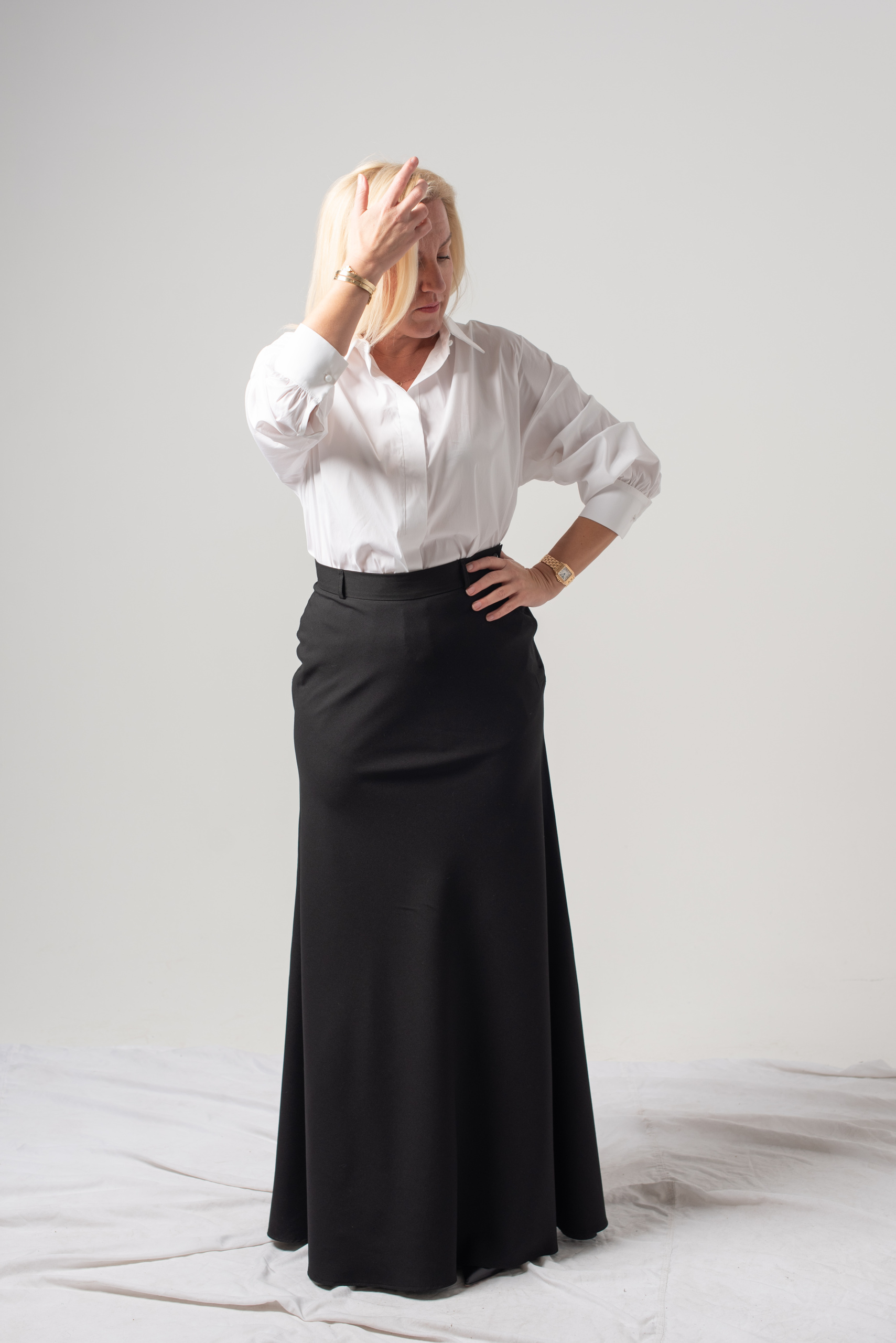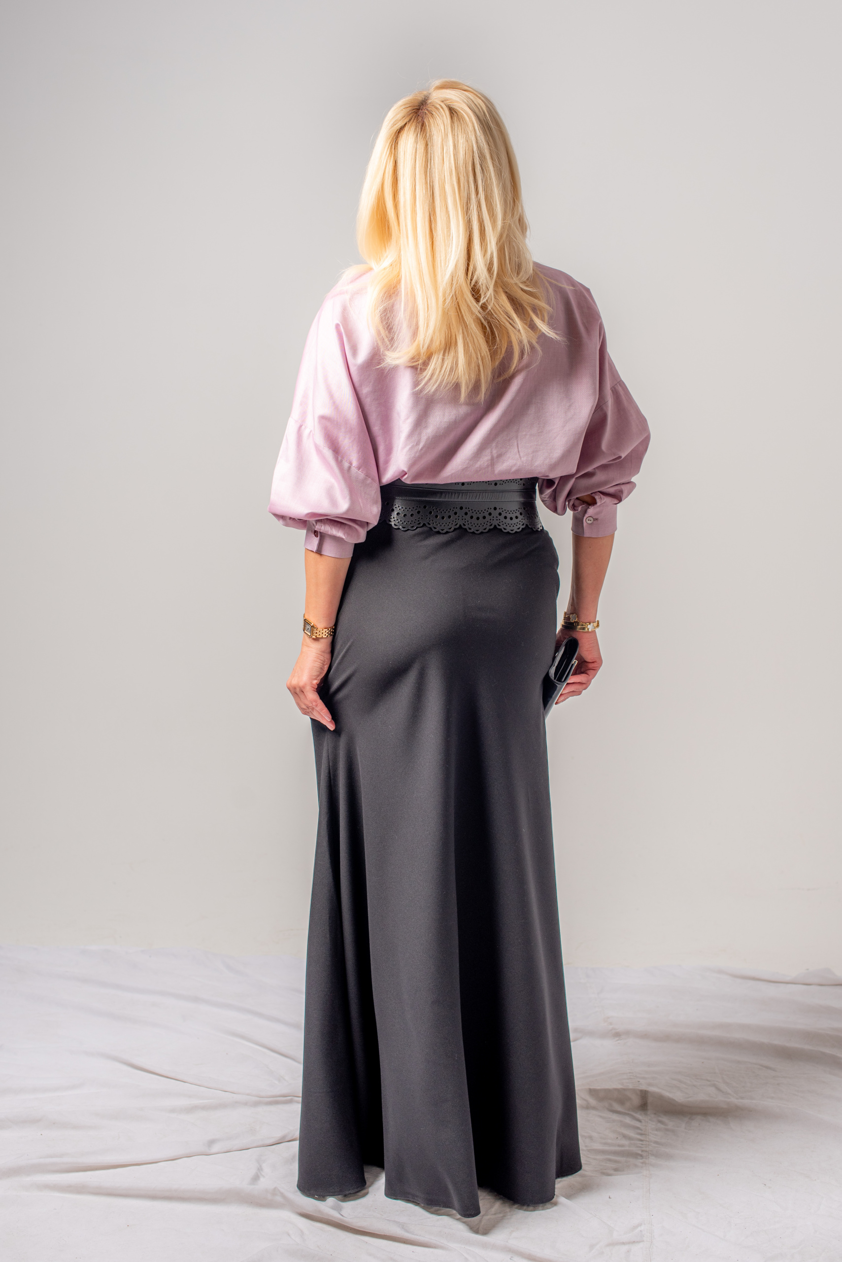 Ova elegantna suknja je dužine do poda. Ima pasicu za remen i kopčanje na cif sa strane.