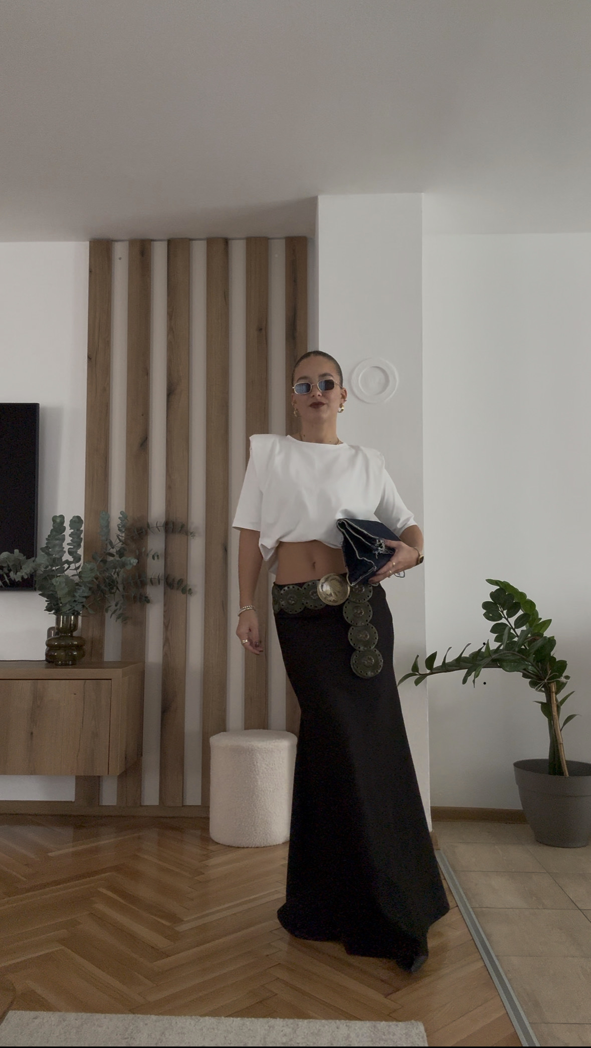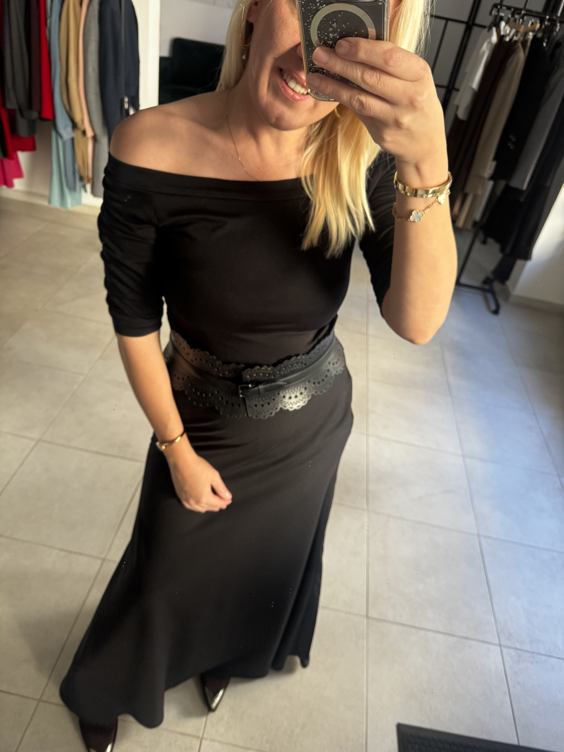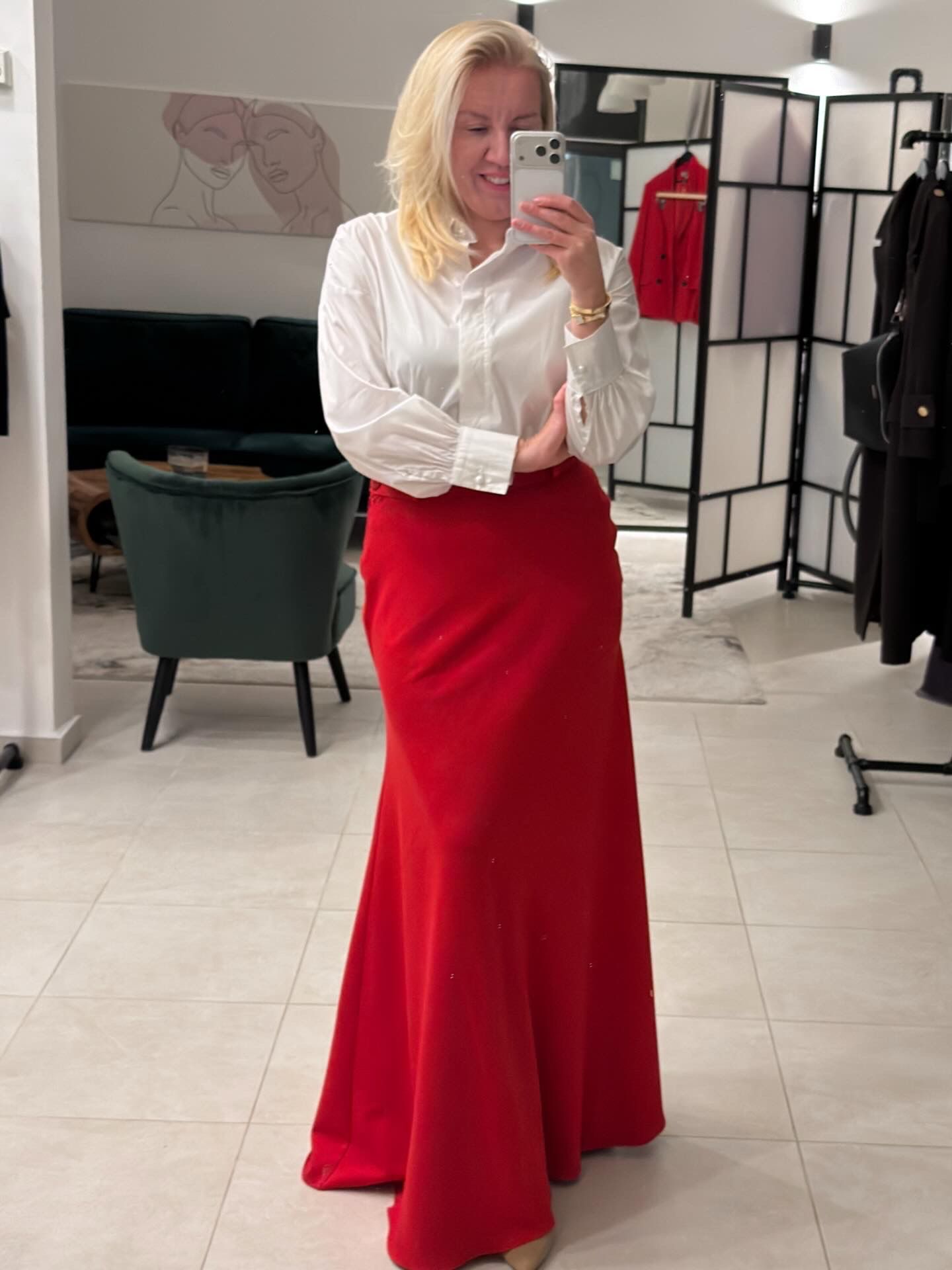 Ova elegantna suknja je dužine do poda. Ima pasicu za remen i kopčanje na cif sa strane.